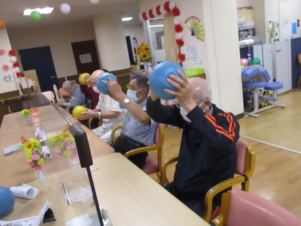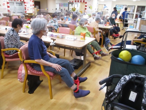 本日の午後は、ボールやセラバンドを使った介護予防運動を行いました。職員のかけ声に合わせ、皆様が一斉に体を動かす姿はとても活気があります。
