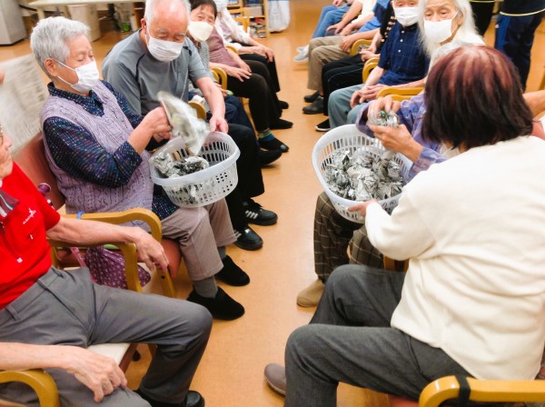後半は「おにぎり丸めゲーム」。くしゃくしゃにして丸めていきます。1人3つ作ります