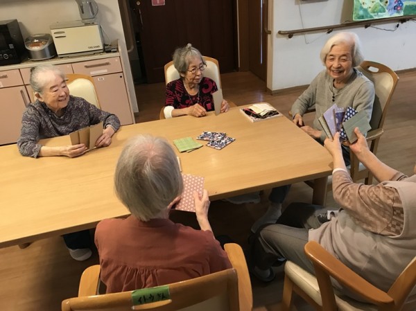 段ボールに柄付きの折り紙を貼って作ったカードを使って