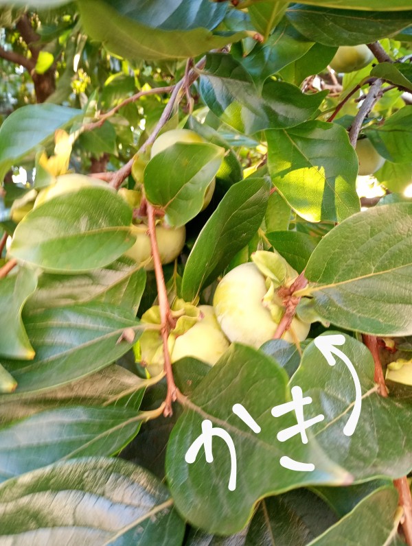 こちらの木…!なんの木か分かりますか?よーーく見るとまだ緑色ですが立派な柿が!!