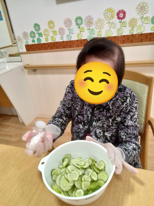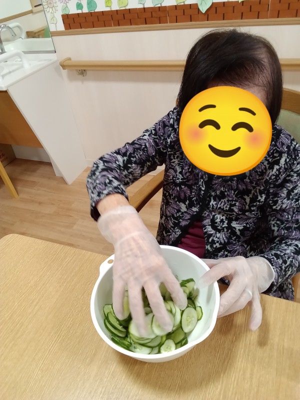 しっかり塩もみして、ちょっとお味見、うん、いい塩梅ね(◠‿・)—☆