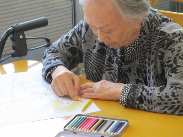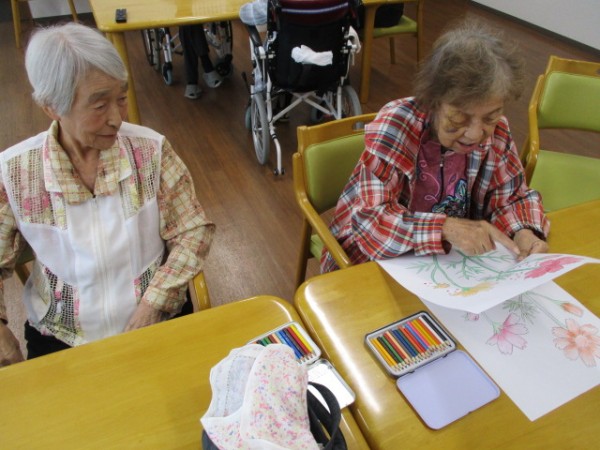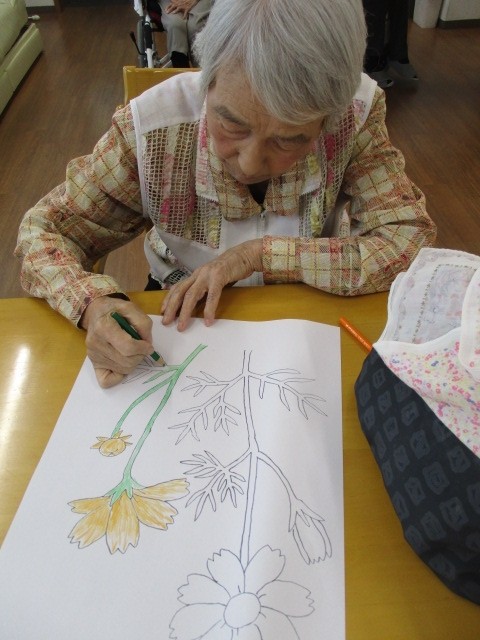 コスモスの塗り絵を行っています( ^ω^)・・・ オレンジやピンクの色で塗られたコスモスのお花綺麗ね! と話されていました(*^_^*)
