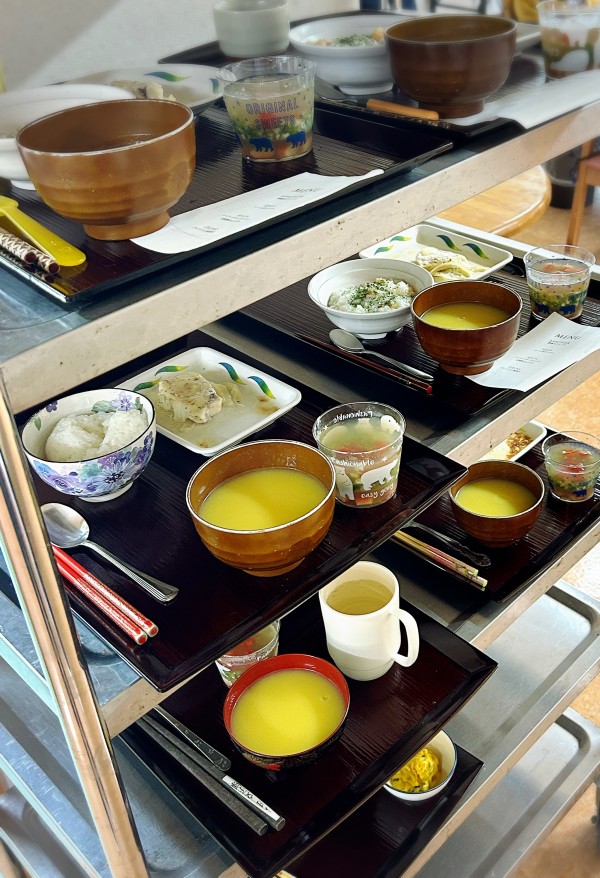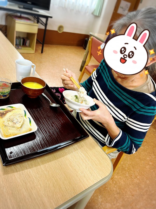 「これなぁに?」とムニエルを召し上がるM様。魚をアルミで包んで美味しく火を通すやつです、と下手糞な説明をすると「ほう!」と納得(?)され、あっという間に完食。「もっと無いの?」とお代わりを所望されておりました(´▽`)