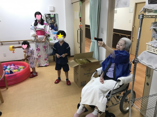 食事のあと は射的、ヨーヨー釣り、輪投げ会場を順番に回ってもらいお祭り気分を味わって