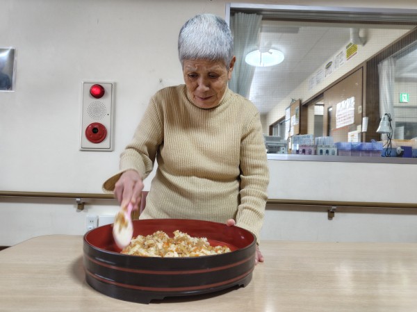 お手伝いの内容は、炊飯器にて炊けたちらし寿司を職員が寿司桶に入れた後、