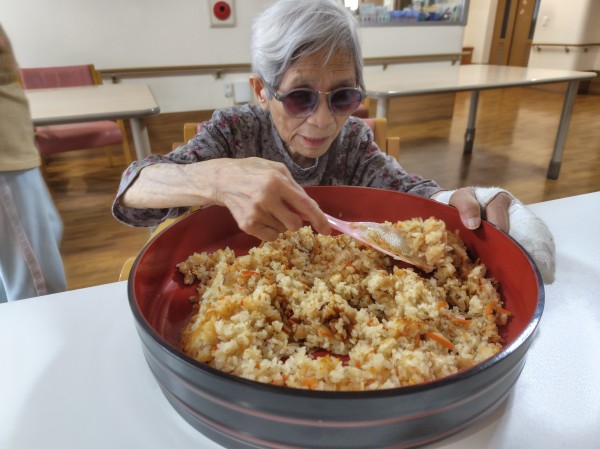 各ご利用者様の座席へと行き皆様にしゃもじを持っていただき混ぜていただきました。