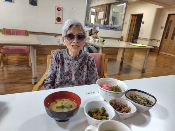 昼食時に完成したちらし寿司・おかずを提供すると、