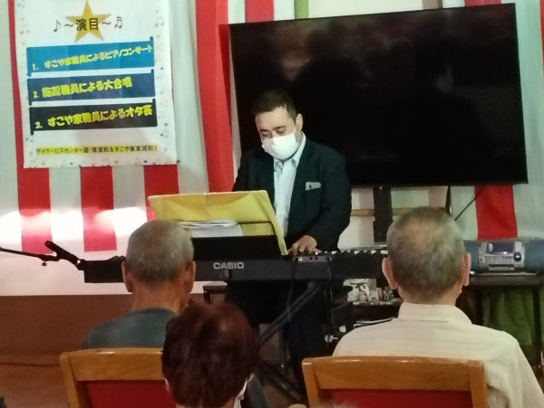 プログラムとしましては、①すこや家の職員によるピアノ演奏、②デイサービスとすこや家の職員による大合唱、③デイサービス、すこや家の職員によるオタ芸を行いました(^^)/。