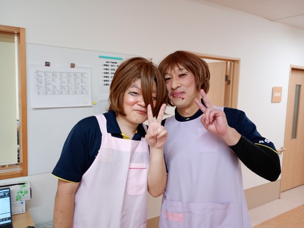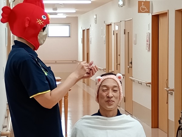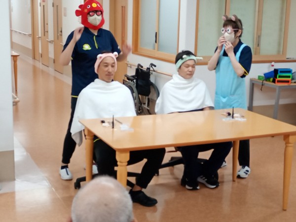 敬老会では二人羽織ならぬ…目隠しでお化粧♬