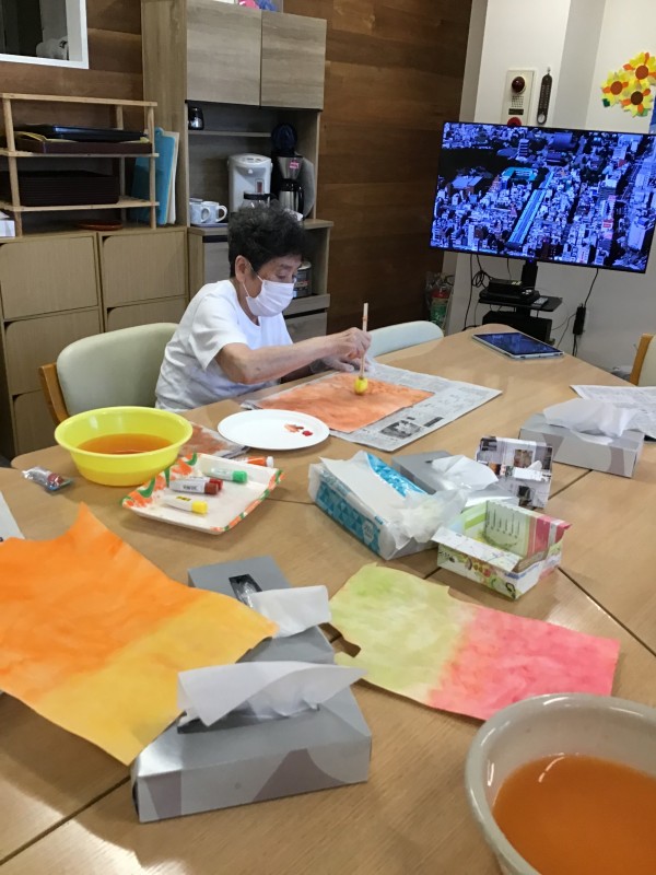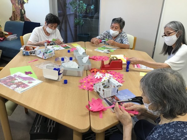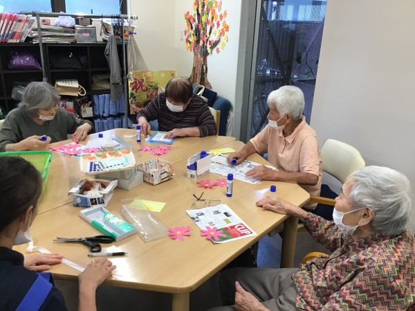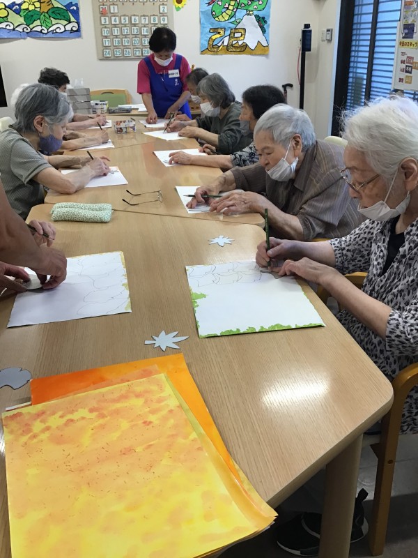 暑かった猛暑の夏もひと段落をし、デイサービス内では背面のフロア飾りを秋の季節へ替えていきます。