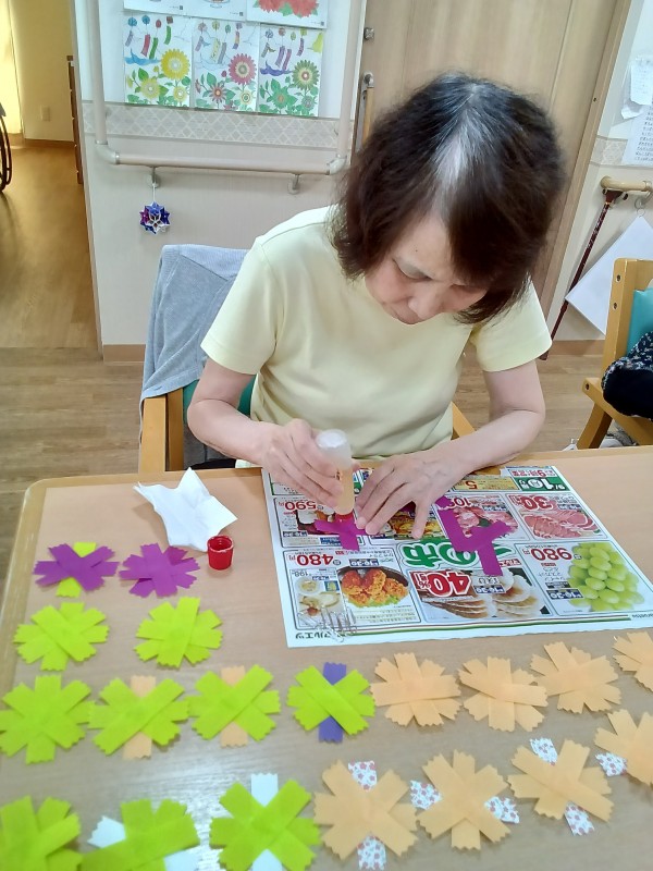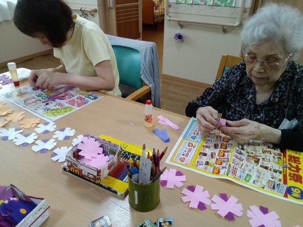ご利用者様に色とりどりのコスモスの花をたくさん作っていただきました。