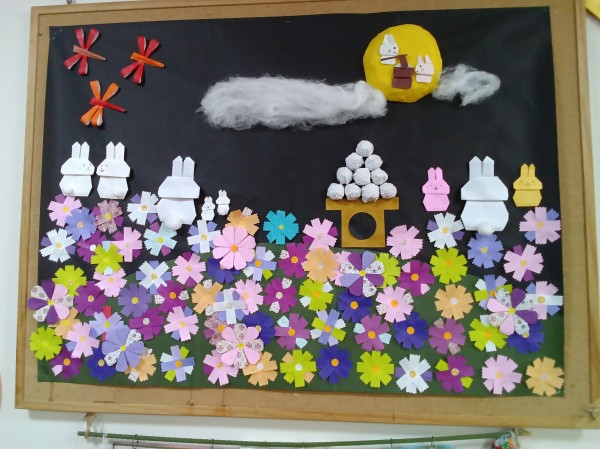 十五夜とコスモスの花の壁飾りが出来上がりました。