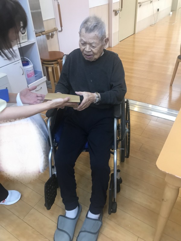 続いて施設からのささやかなプレゼントをお一人お一人に手渡ししていきます