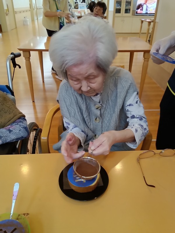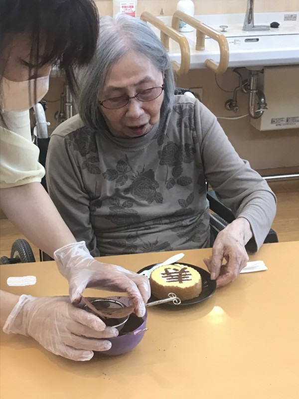 ロールケーキに「寿」の文字を自分で入れるおやつレクを計画しました(^^♪