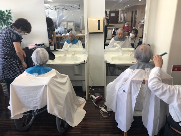 すこや家北新横浜で訪問理美容に入ってくれているのがこちらの方々です。カット&ブローをひとり一人のカウンセリングをして好みの髪形にカットしてくれますよ。4階のロビーを使用しています