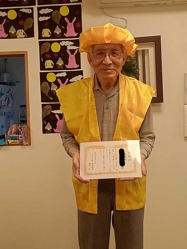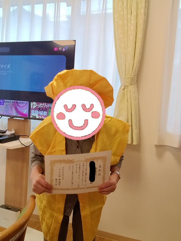 表彰状のお渡しと、ちゃんちゃんこを着ての記念撮影を行いました♪