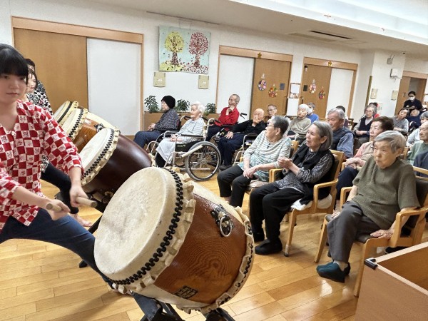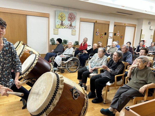 入居者様の数名は太鼓をセッティングしている時から見学されていて、小さなお子さんが手慣れた様子で器材を運んでいる様子を見て「すごいねー」「偉いねー」と感心されていました。