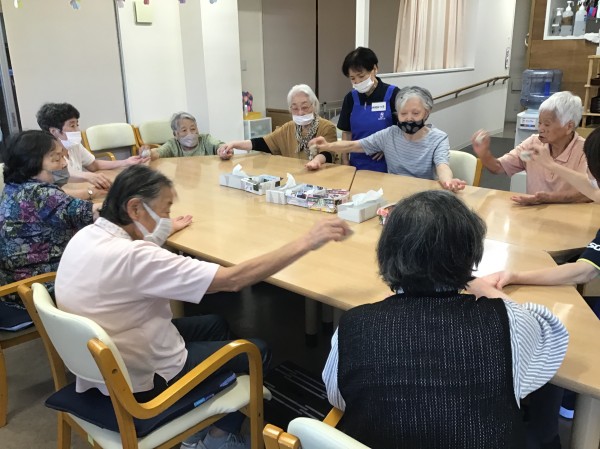 ①音楽に合わせてお手玉を隣の方に順番に渡していきます。