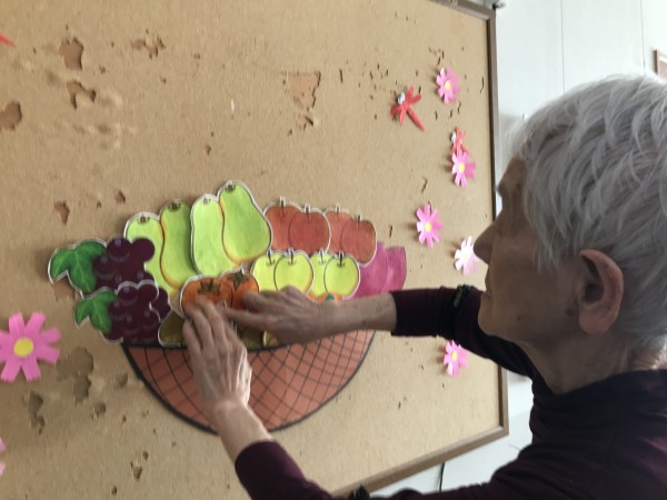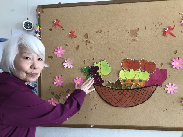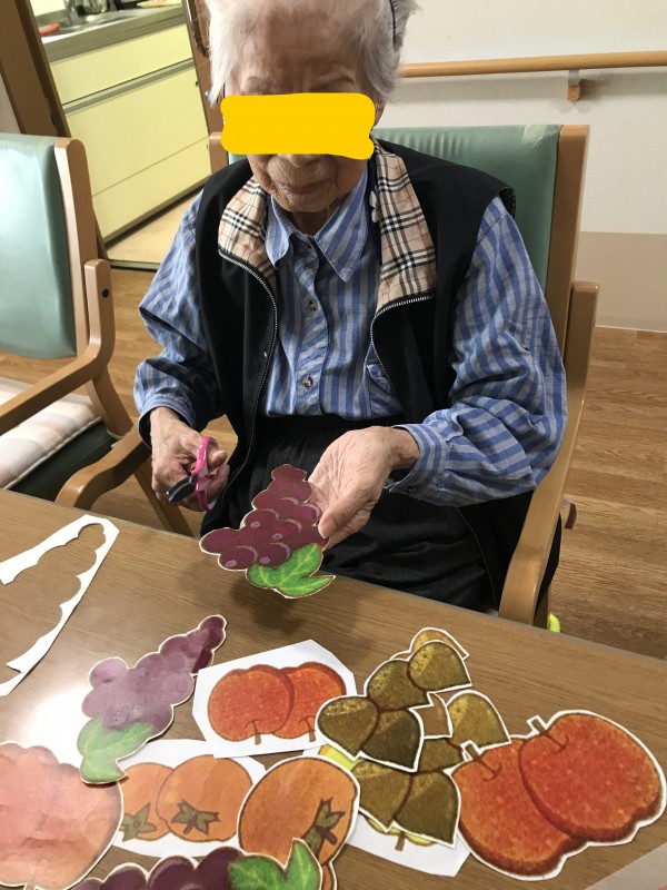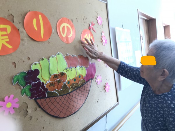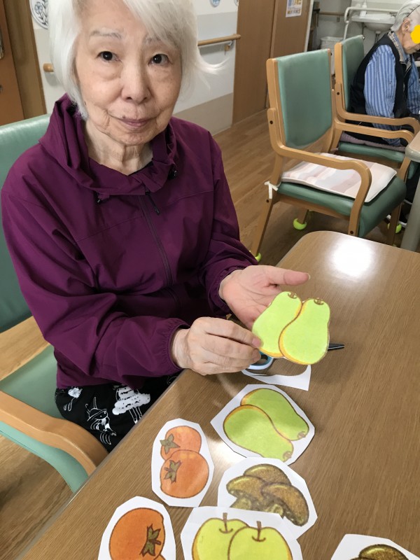 先日みなさんと秋の野菜や果物の絵を切って掲示しました♪
