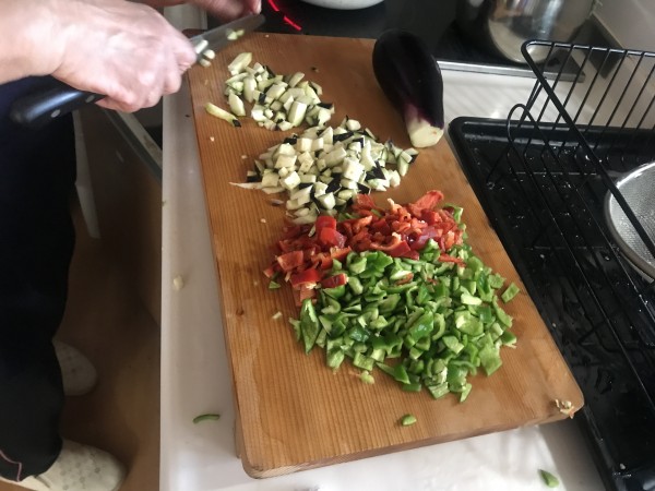 ご利用者様にも手伝って頂き、野菜を賽の目に切ってから油で炒めて砂糖と味噌で味付けしました♪
