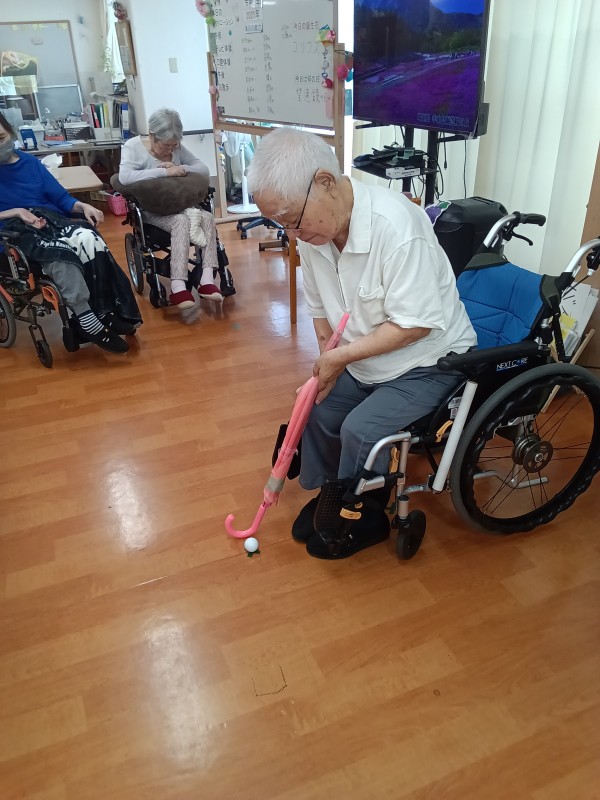 ゴルフボールがカップに入って、ペットボトルが起き上がると