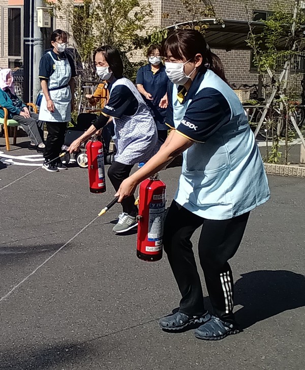 全員無事避難完了しました。今度は消化器の使い方の実践です。