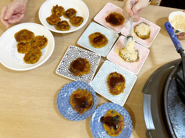 ホットプレートで焼き始めると、カボチャとチーズの香ばしい匂いが広がります。焼き色がついてくると、「それは私の!」「一番大きいのはおれのだ!」と、F様やF男様が楽しそうに声を上げ、笑い声が絶えません。
