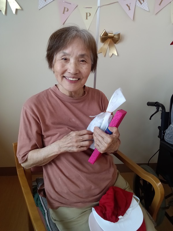 こんにちは。。。10月にお誕生日をお迎えになりました。ご入居者様のお誕生日会をお送りいたします。スタッフの手づくりのカード、プレゼントをお渡しさせて頂きました。普段あまり話されないご入居者様が本当に嬉しかったのか、プレゼントをお渡したとたん、たても興奮され多弁になられたのが印象的でした。皆様とても素敵な笑顔でこの1年・・・笑顔溢れる1年でありますように❤
