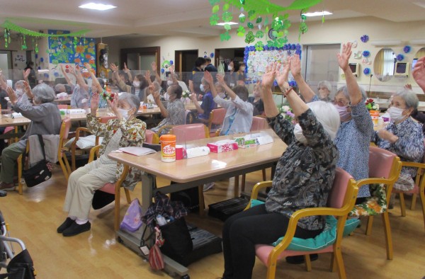「いち、に、さん、よん!」と声を出しながら、手をたたいたり、足をあげたり。カウントに合わせリズム良く動くことで自然と笑顔があふれ、デイルームは明るく元気な雰囲気に包まれました。