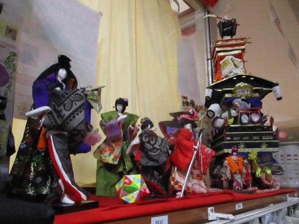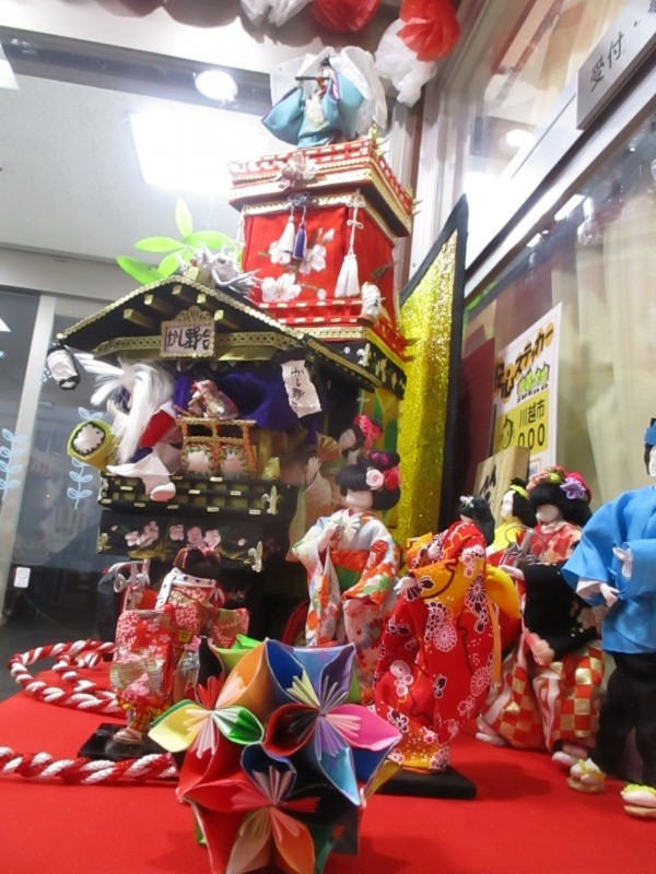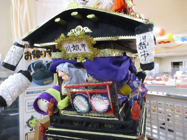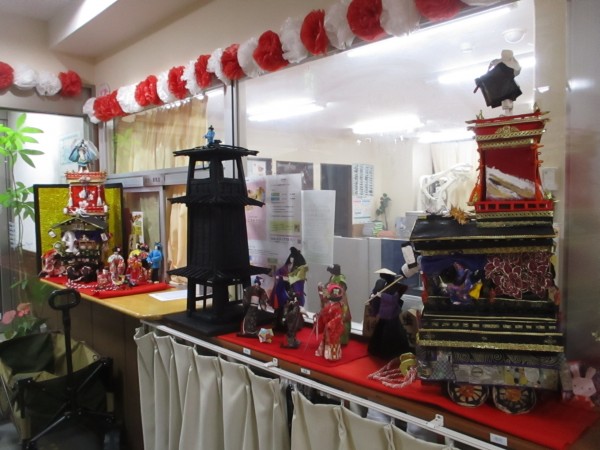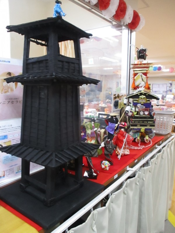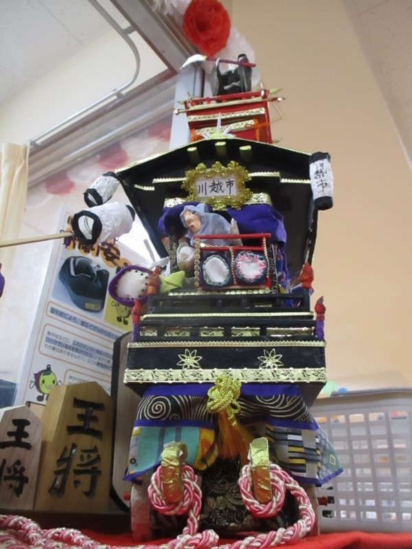 残念ながらデイサービスではお出かけできませんが、少しでもお祭りの雰囲気を感じていただきたいと、今年はデイサービスの入り口に川越祭りの山車二台と時の鐘と様々なお人形の展示を行いました。
