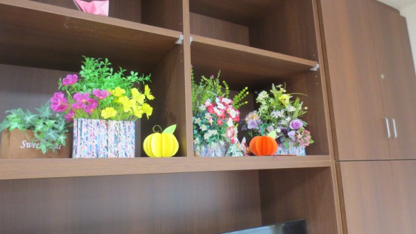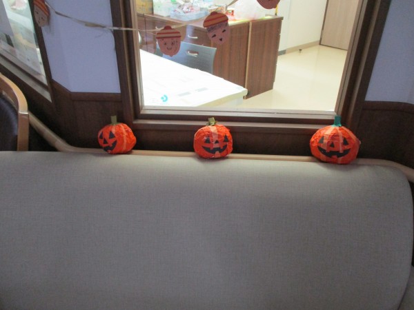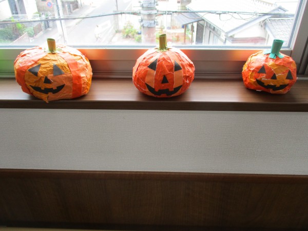 顔付きかぼちゃ、ジャック・オー・ランタンは去年作ったもので、もう1種類の方が今年のかぼちゃの置物制作レクで作ったものになります。