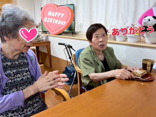 オヤツにはバースデーケーキをご用意させて頂きました。お仲間からの祝福を受け、照れながらも嬉しいひととき。