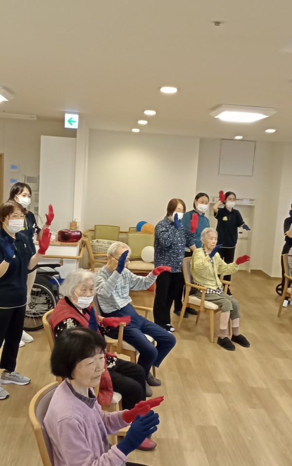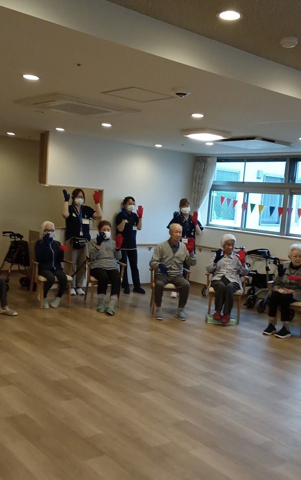 赤青旗揚げは、私たちの施設では旗ではなくカラー軍手で代用しました。