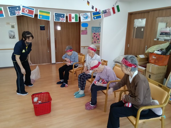 今日は1階・運動会レクを行いました。 そのご様子をお知らせいたします!! 玉入れとパン食い競争を行いました。