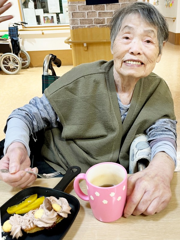 今月お誕生日を迎えられたのはⅯ子様(91歳)。職員よりささやかなお祝いの色紙を送らせていただきました。そして「お誕生日の抱負を一言お願いします。」とお伝えするとⅯ子様はにこやかに「これからも健康で、みんなと仲良く暮らしていきたいです。」とお話しくださいました。その優しい言葉に温かい拍手が起こりました。そして、ハロウィンが近いこともあり、K子様とY様は魔女の帽子とマントを身にまとい、かわいい仮装で参加。お二人は「ハッピーバースデー♪」の歌を大きな声でノリノリに歌ってくださり、笑顔と笑い声でいっぱいになりました。ケーキを配ると、「これ今作ったの?美味しそう!」とⅯ子様。一口食べて「美味しいねぇ」と笑顔を見せてくださいました。Y様はフォークを手に嬉しそうにぱくり!K子様は「わぁ~すごい!美味しそう!」と目を輝かせながら、黙々と味わっておられました。O様は1番に食べ終わると満足そうな笑顔。(*´▽`*)