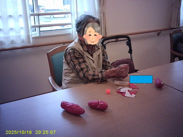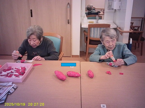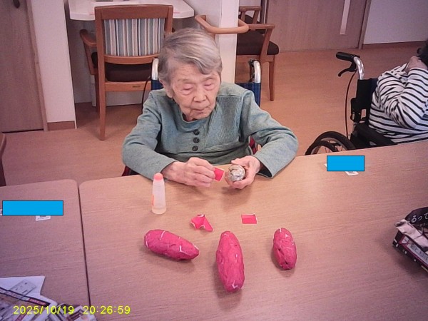 新聞紙をさつま芋の形にして小豆色の折り紙を小さくちぎってのりを付けて貼っていきます