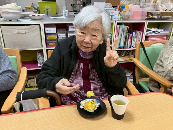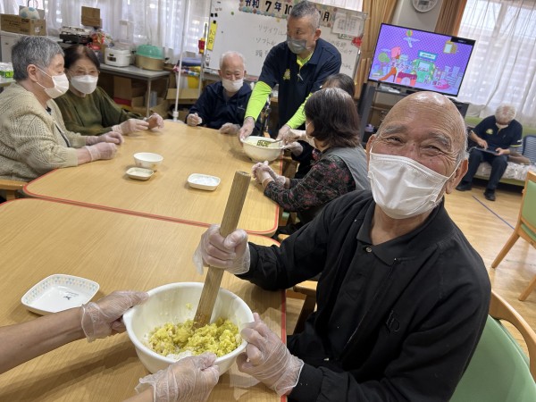 2キロのさつまいもを茹で、みんなで分担してしっかりと潰していきました。潰すのは、得意よ!とニコニコしている方や疲れたから代わって!と隣に早く回す方・・・皆さんとにかく楽しそうでした(๑˃̵ᴗ˂̵)