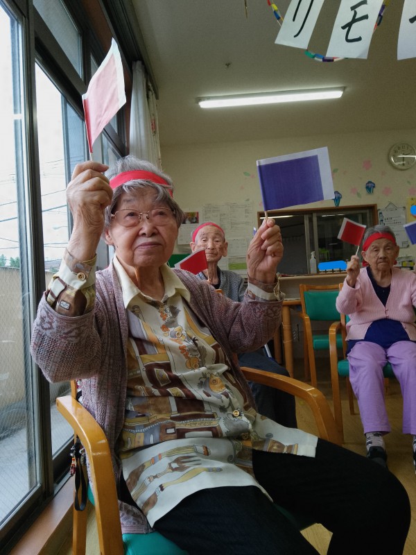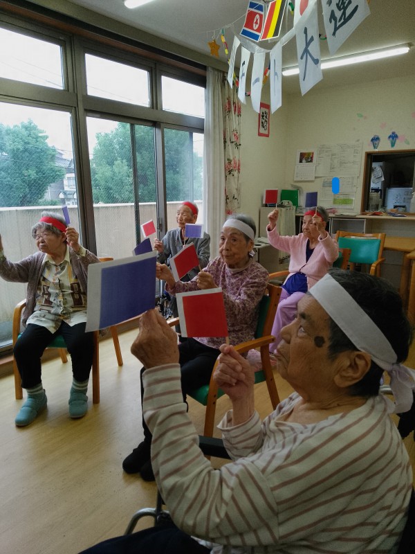 運動・トレーナーの指示通りに旗を上げ下げし
