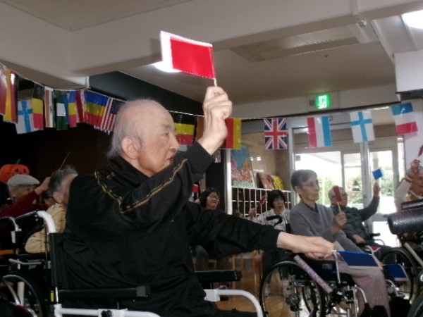 と、号令に従って赤と青の旗を上げ下げします。