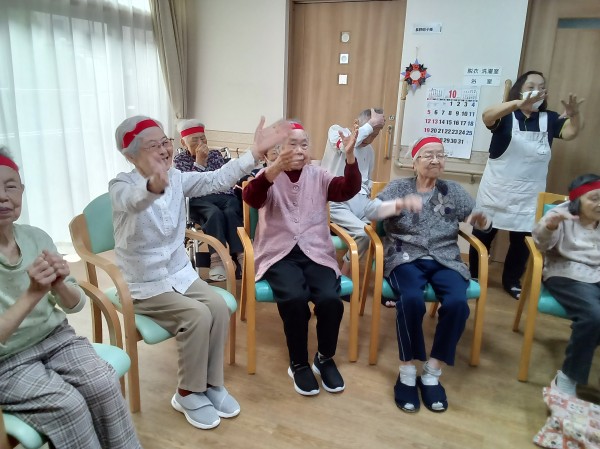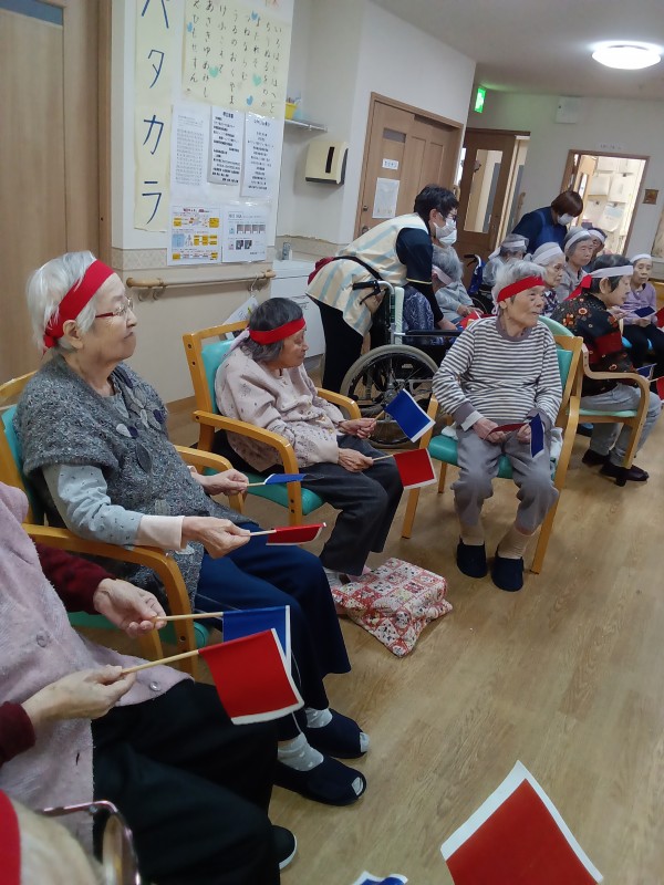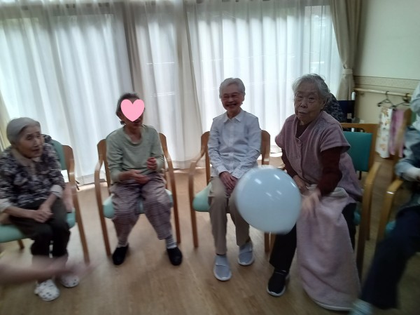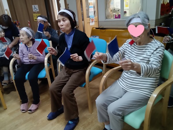 1階、2階チームに別れて風船バレー、玉入れ、赤旗青旗上げゲームに熱戦がみられました。