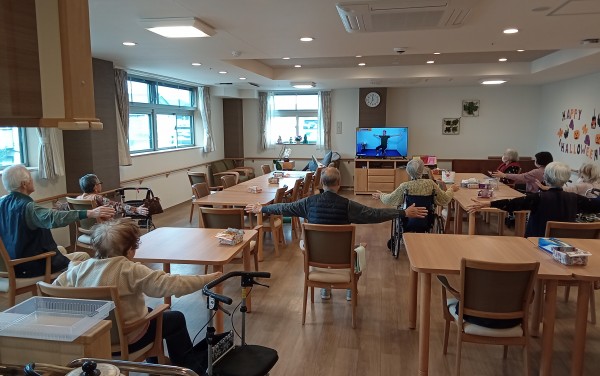 当施設では、11時半と15時と2階ホールにて体操を毎日開催しています。