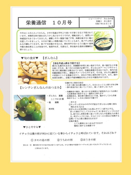 #介護 #介護施設 #ショートステイ #短期生活入所介護 #老人ホーム #介護サービス #認知症 #認知機能向上 #高齢者 #健康長寿 #抗酸化物質 #栄養 #旬の食材 #ぎんなん #秋バテ予防 #老化防止 #熱中症対策 #健康 #秋 #免疫力 #がん予防 #心臓病リスク