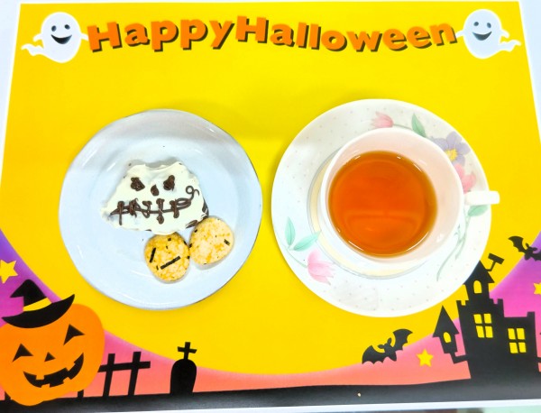 本日のおやつは????おばケーキとプチせんべいお茶は紅茶をご提供????