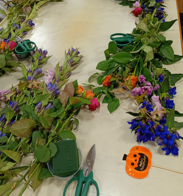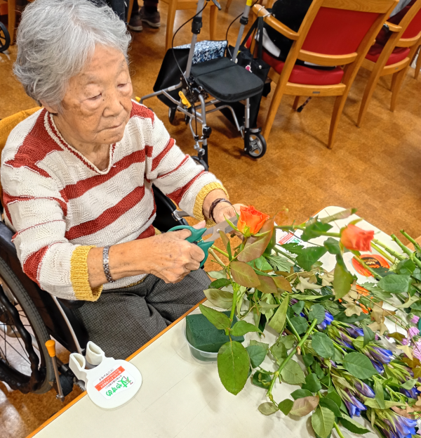 今回は、先日、1階デイサービスにて行なわれた、「フラワーアレンジメント」の様子をお伝えします。
