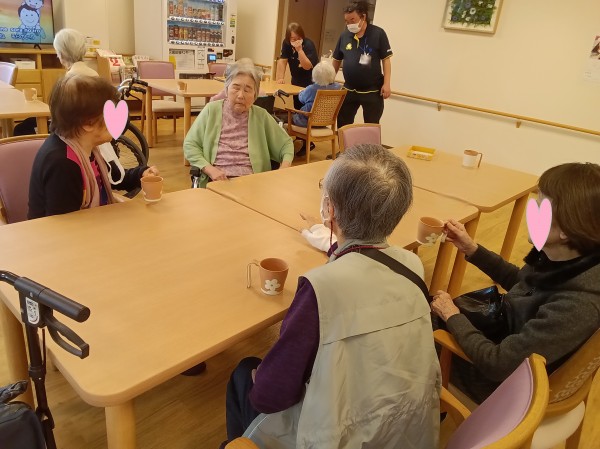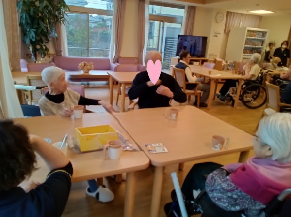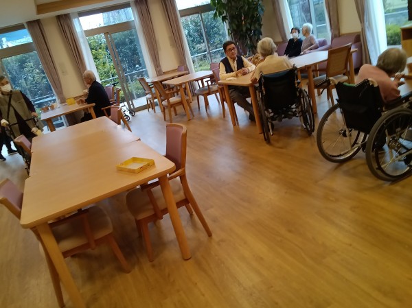 少ない男性ご利用者様同士で「こんにちは」と話したり。