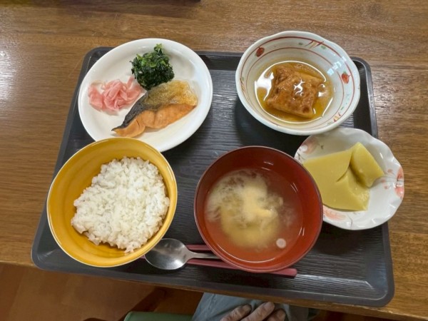 職員がおかずを盛り付けている隣で 利用者様がご飯とお味噌汁をよそって下さいました