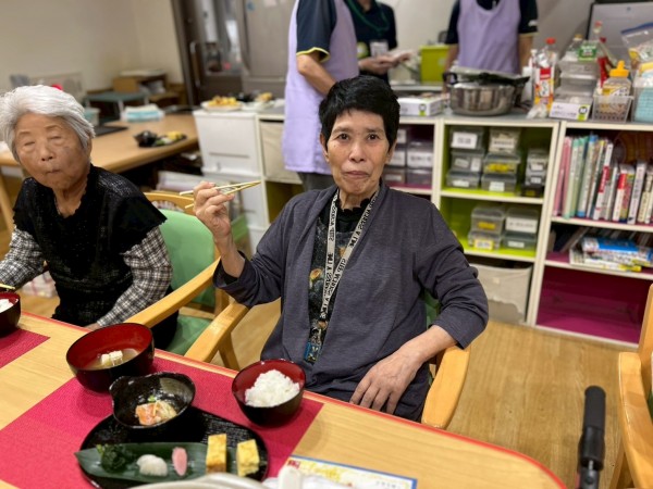 けんちん汁は、大根・人参・ごぼう・長ネギ・里芋・油揚げ・木綿豆腐と具沢山にしました。ぐつぐつ煮込んだのでだしの香りがフロアに広がり「いい匂いがすると」の声が(๑>◡<๑)