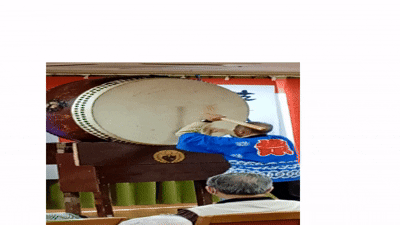 すごい格好で太鼓を持ってきました。