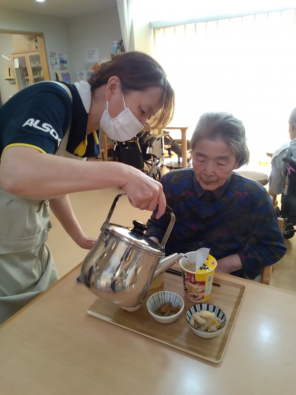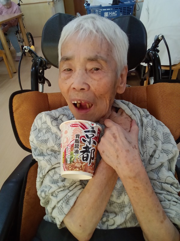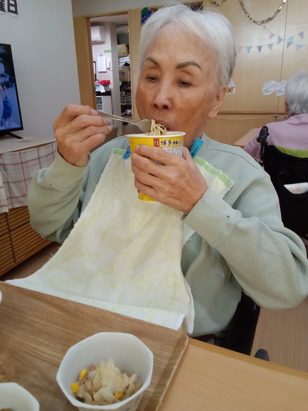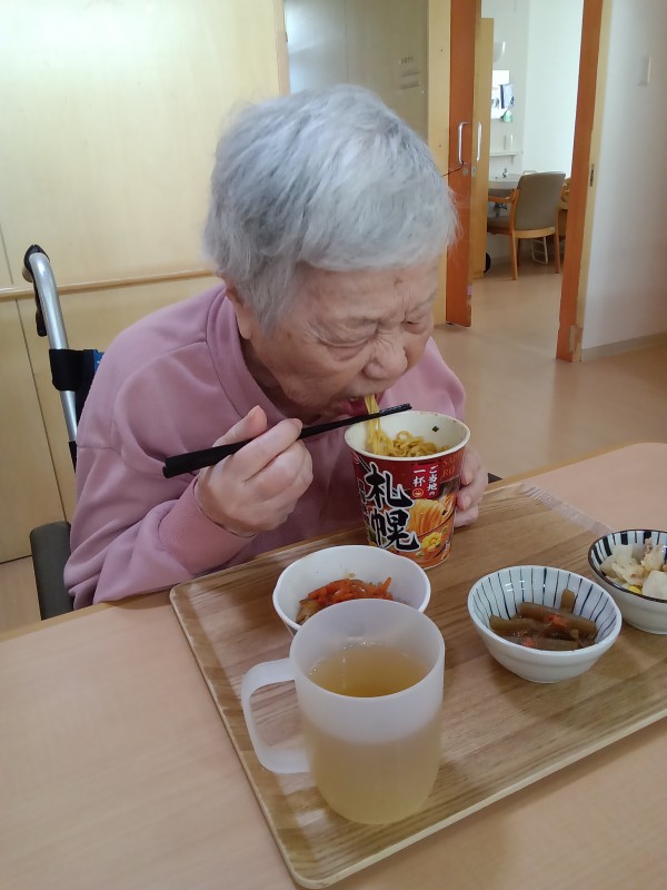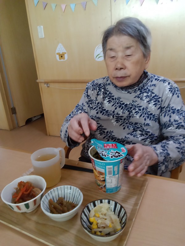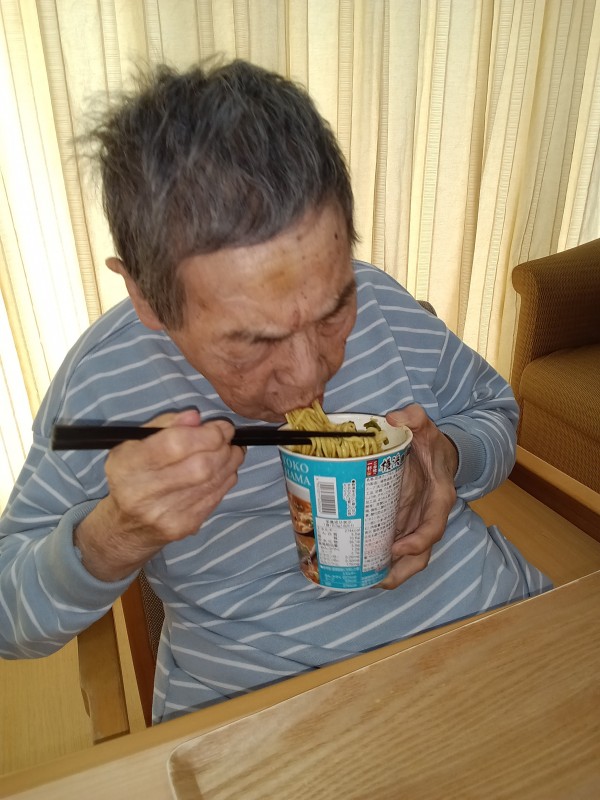 カップラーメンを食べる食事レクの様子について、