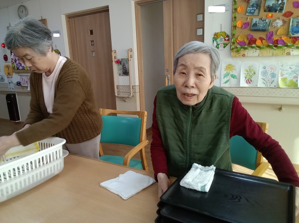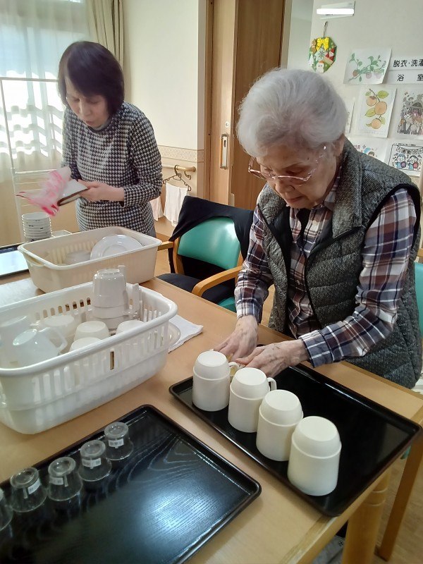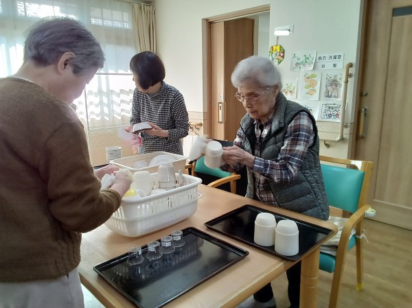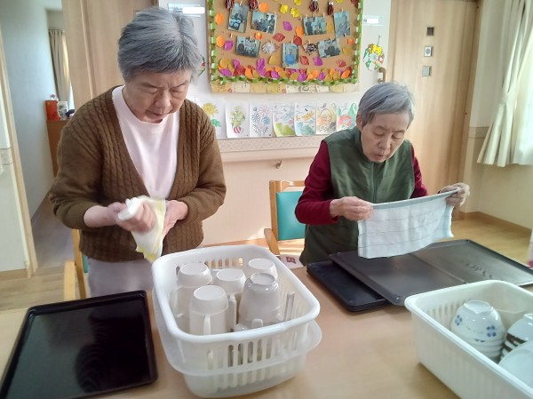 ご入居者様に食後の食器拭きをお願いしています。